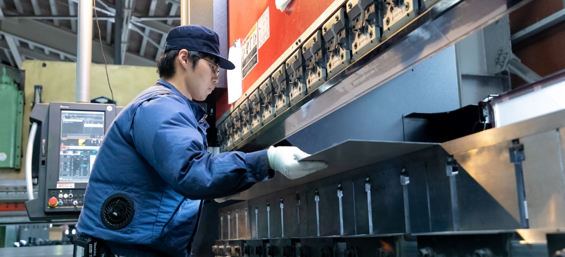 ダイデンの機械加工業務は、設計図や工作図に基づいて鋼板を加工することから始まります。シャーリングで鋼板を切断し、タレットパンチプレスで穴開けや切欠きを行います。その後、ベンダーを使って鋼板を正確に曲げ、製品の部品を整形します。